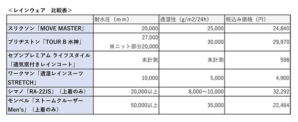 「耐水圧」「透湿度」「価格」を一覧にしてまとめてみた