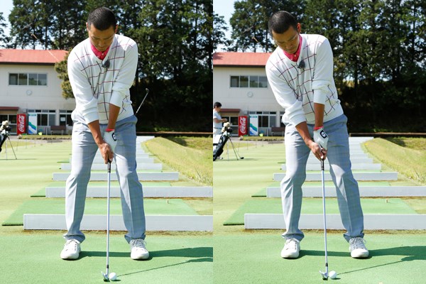 写真左の基準となるアドレスと比較。体が右に傾くとすくい上げが強くダフリやトップが頻発する。フックの原因にもなる