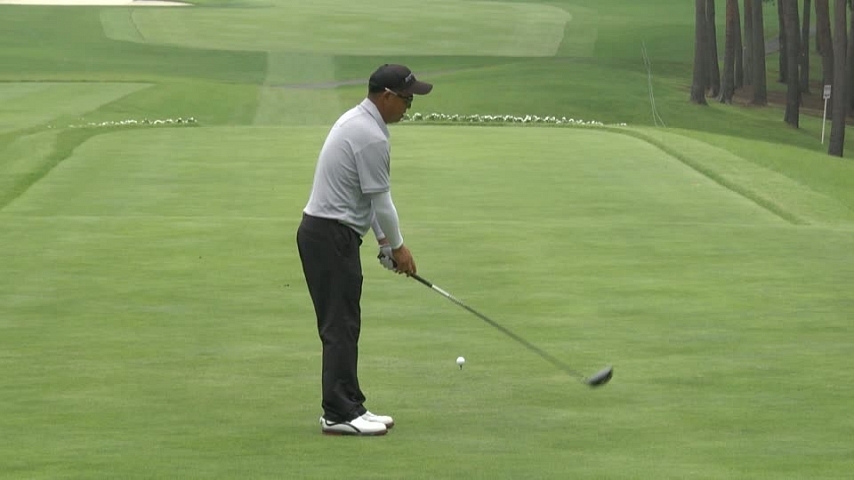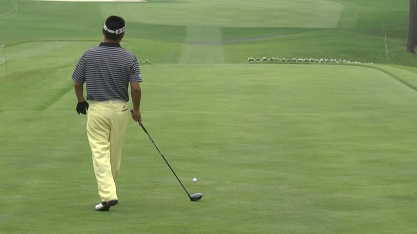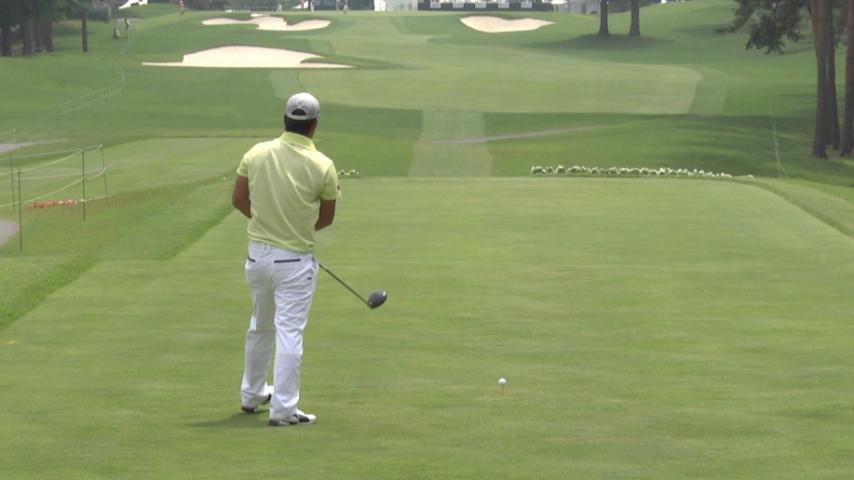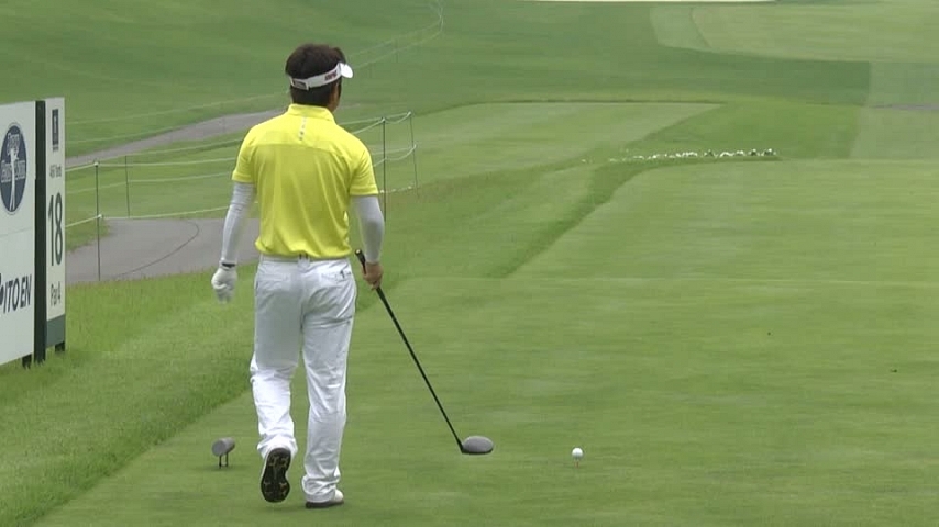 ドローを打つためのルーティン ティグラウンドの左サイドにティアップしている松村選手。この位置にティアップしているのは右サイドからドローボールを打ちたいから。ドロ..